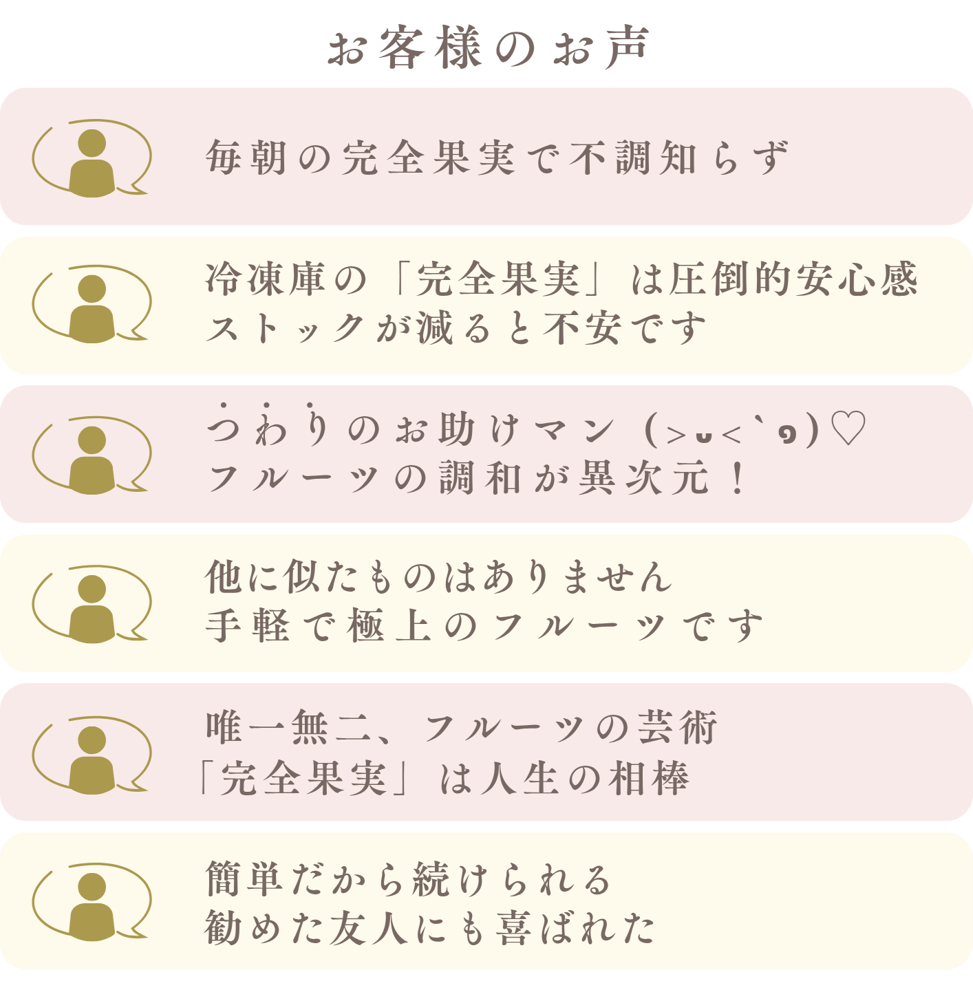 複数種の生フルーツを搾り、混ぜ合わせたものです。果汁と果肉だけ。フルーツの食感と栄養価を活かしてお届けします。”今日の食が明日の自分”