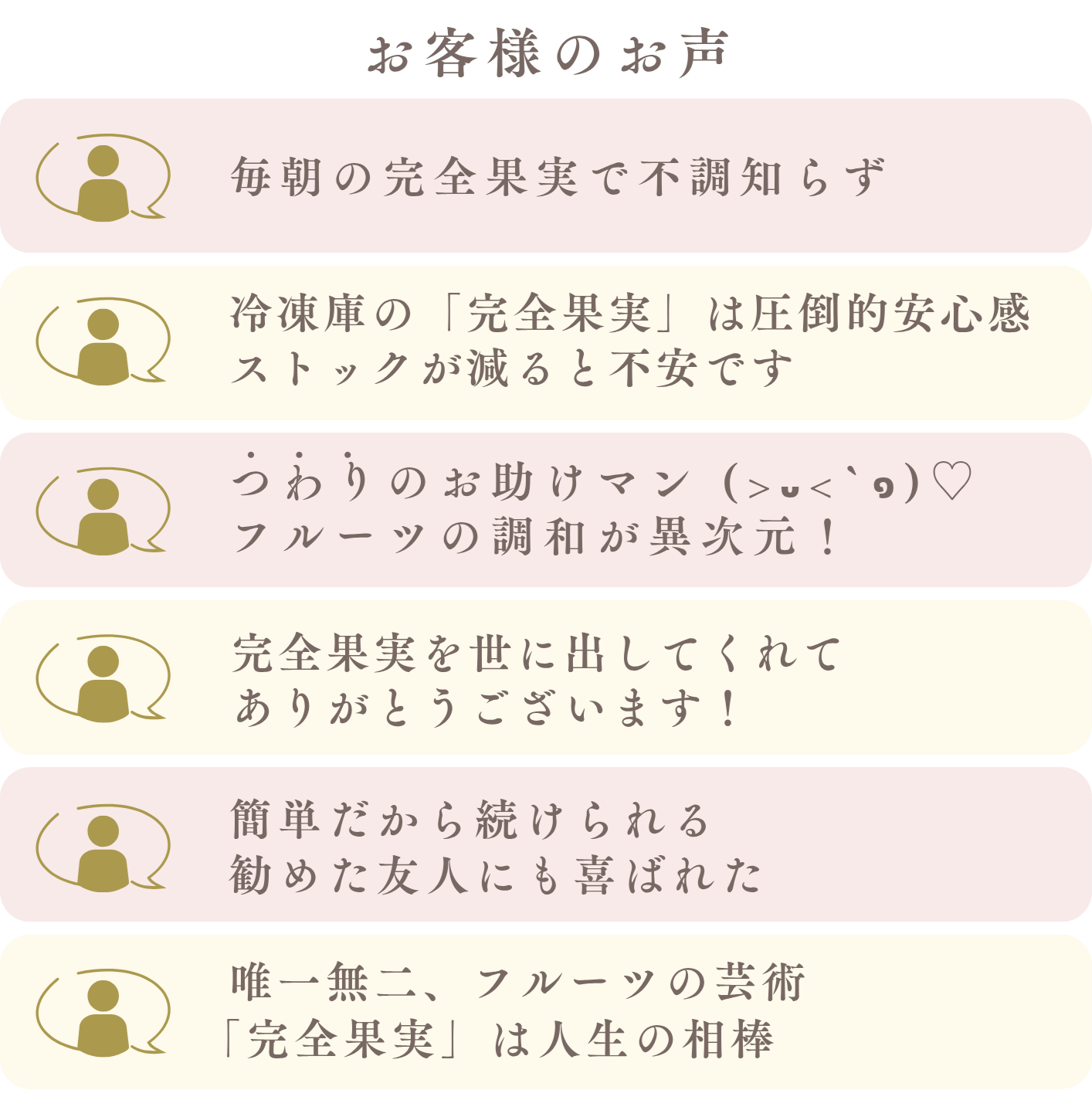 ■完全果実プレミアム 6個セット 「大切な方へのギフトやご自分のご褒美にも」 キャップ付きスタンドパックのプレミアム仕様です。ギフトにも喜ばれています。(ギフトには熨斗シール対応:最終画像参照) 100%生搾りフルーツを、特殊技術で混ぜ合わせたフルーツピューレ(冷凍品) 砂糖不使用、添加物不使用、非加熱 完全果実の詳細は【くわしくは】のページをご覧ください。 ■180g × 6個 ■使用原材料 【通常品】 リンゴ、バナナ、ミカン、レモン、柑橘類(表記以外のフルーツが入る場合があります、製造ロットによりキウイフルーツが入る場合があります) ■アレルゲン(28品目対象) オレンジ、リンゴ、バナナ、(キウイフルーツ) ■賞味期限 製造から18ヵ月:商品に記載 ■栄養成分表示(100gあたり) エネルギー・・59kcal たんぱく質・・・0.6g 脂質・・・・・・・・0.2g 炭水化物 ・・・15.8g 食塩相当量・・・・0g 【送料】 一律1,200円:冷凍クール便 (北海道、九州、沖縄は別途料金) 何点ご購入頂きましても、追加送料はいただきません 【お届け日時指定のお願い】 冷凍クール便配送のため、ご注文時にできる限りお受取り日時指定をし、当日のご在宅をお願いいたします (配送スタッフさんの業務負荷を減らすため) ご指定がない場合は最短で発送いたします