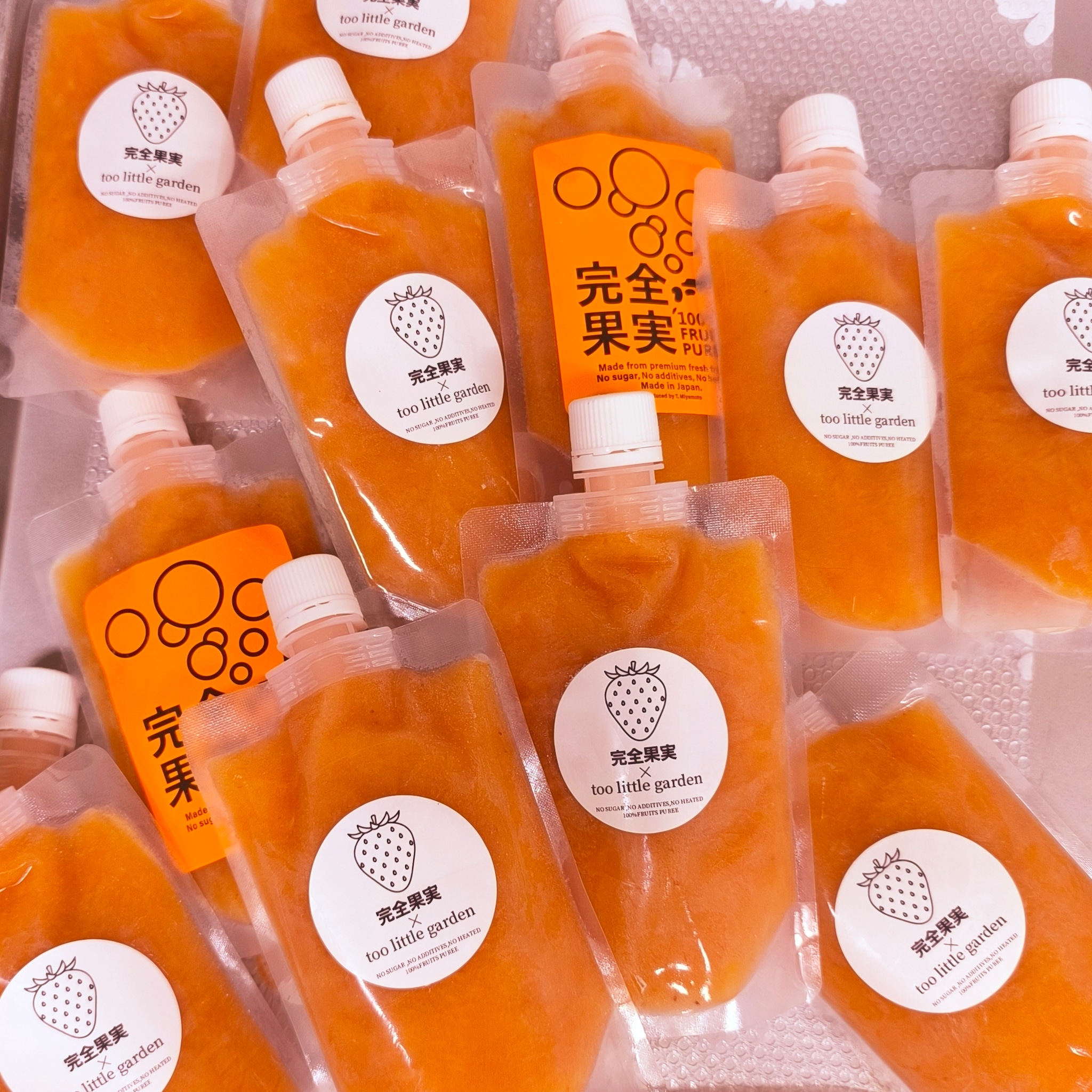 生産ピーク期の素材が廃棄の危機にあり、その情報をキャッチした親しいフルーツマニアが生産者さんと完全果実の縁結びをしてくれました。廃棄が防げコストゼロで自社ブランド製品ができる仕組みなので、生産者さんにとても喜んでいただけました。