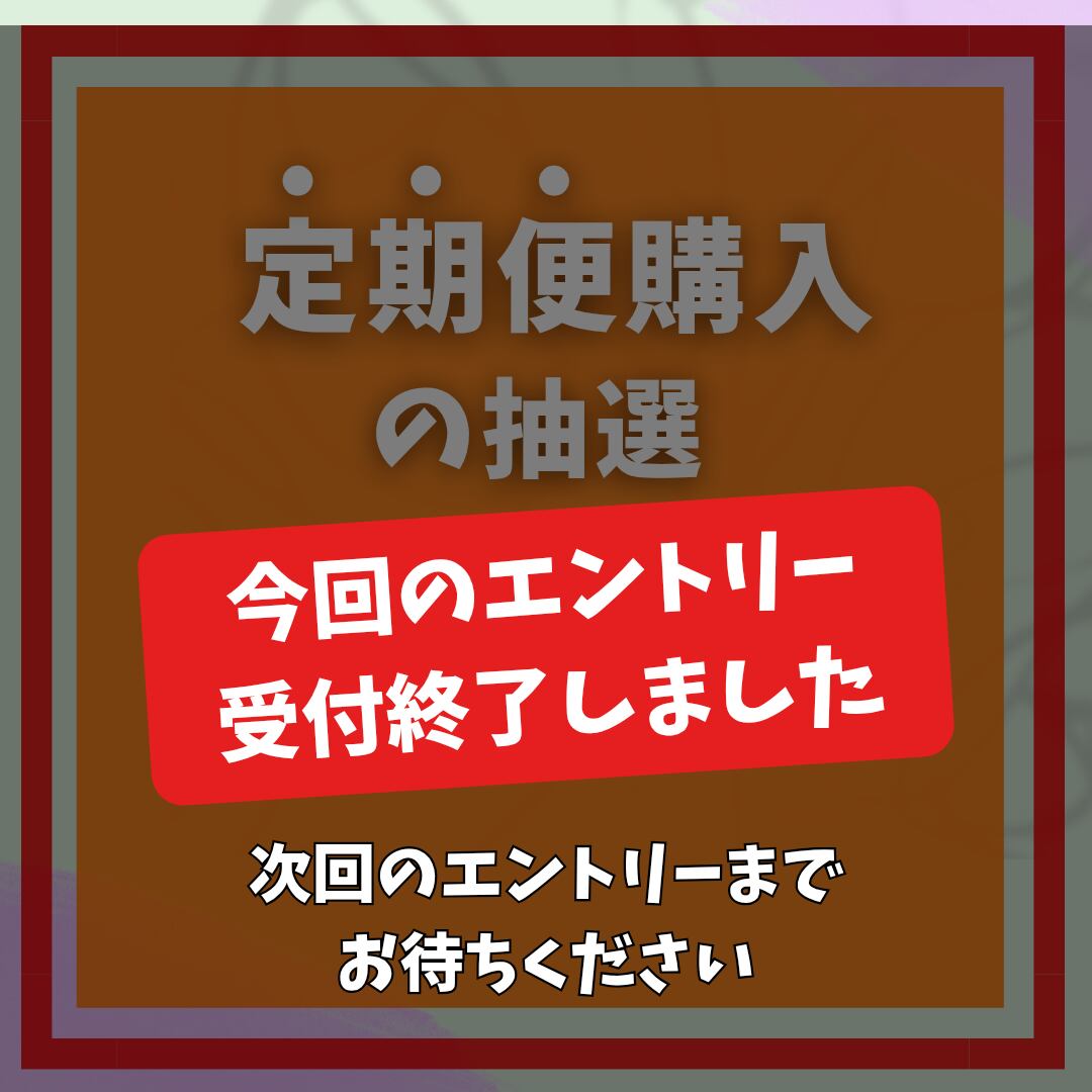 自動抽選システムを利用し、運営者は当落に関するコントロールをしません。ご当選者には当方よりメールで定期便購入に関する確認事項をお知らせいたします。メール到着日より3日以内に返信メールをください。(ご返信がない場合は当選辞退と解釈いたします。その際に当選時に決済される費用は違約金となり返却されませんのでご注意ください)